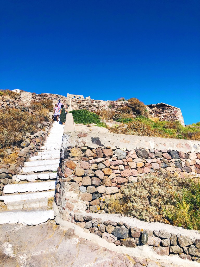 Νωρίς το απογευματάκι αποχωρήσαμε από την παραλία με βαριά καρδιά, γιατί θέλαμε να επισκεφθούμε το κάστρο! Η απόσταση με το αμάξι είναι περίπου 25’. Το ενετικό κάστρο της Μήλου βρίσκεται στην Πλάκα, στην τωρινή της πρωτεύουσα. Βρίσκετε στην κορυφή του λόφου και θέλει αρκετό σκαρφάλωμα οπότε προετοιμαστείτε! Σταθερά παπούτσια και όχι μέσα στο μεσημέρι! Θα μπορούσατε να πάτε στο ηλιοβασίλεμα, αν και γι’ αυτό σας έχουμε και άλλη μια πρόταση παρακάτω! Στην καστροπολιτεία θα συναντήσετε αρκετές εκκλησίες μεταξύ αυτών της Κοίμησης της Θεοτόκου ή Παναγιά Σκινιώτισσα, καθώς και την αγαπημένη μας εκκλησία της Παναγίας της Θαλασσίτρας. Στον δρόμο για την κορυφή θα βγάλετε υπέροχες φωτογραφίες! Όταν φτάσεις στην κορυφή του κάστρου θα κοιτάξεις κάτω και θα μαγευτείς… θα δεις τα σπιτάκια τόσο μικρά που θα νιώθεις τεράστιος, θα δεις το αιγαίο πέλαγος απέραντο μπροστά σου σαν ένα μαγικό μπλε χαλί που κάποια στιγμή ενώνεται με τον ουρανό και δεν τα ξεχωρίζεις! Και στην μέση ο ήλιος θα έχει απλώσει ένα χρυσό χαλί για να περπατήσει η φαντασία σου!
