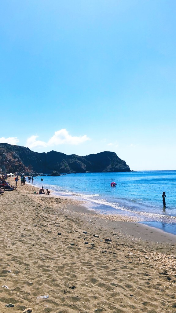 Παλαιοχώρι! Αυτή ήταν η επιλογή μας! Το Παλαιοχώρι αποτελείται από τρείς παραλίες, από τις οποίες η καλύτερη, κατά την γνώμη μας, είναι η τρίτη. Η τεράστια παραλία του είναι ηφαιστειακής προελεύσεως και περιτριγυρίζεται αμφιθεατρικά από βράχια γεμάτα ηφαιστειακά χρώματα, κίτρινο, πράσινο, κόκκινο! Τα τεράστια βράχια με τους εκπληκτικούς χρωματισμούς, η άμμος και τα μικρά πολύχρωμα βοτσαλάκια σε συνδυασμό με τα καταγάλανα νερά δημιουργούν την αίσθηση ενός εξωπραγματικού τοπίου! Ενώ αν πάτε νωρίς θα μπορέσετε να κολυμπήσετε μαζί με ψάρια, και δεν εννοούμε τα μικρά ψαράκια που βλέπετε συνήθως!
